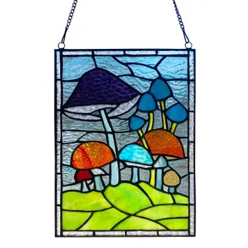 Add a touch of magic to any room décor with the 11.5"H Erin Green Mushrooms Stained Glass Window Panel from River of Goods. Handcrafted from a whopping 109 individual glass cuts, this 11.5" high stained glass suncatcher is constructed using artisanal soldering methods. Featuring green, red, orange, purple, blue and clear hues, the textured Tiffany-style glass cuts form an image of different mushrooms on a grassy patch of ground. Best of all, the included 24" metal link chain allows for immediate hanging, making it easy to transform any room into an oasis of multicolored light.